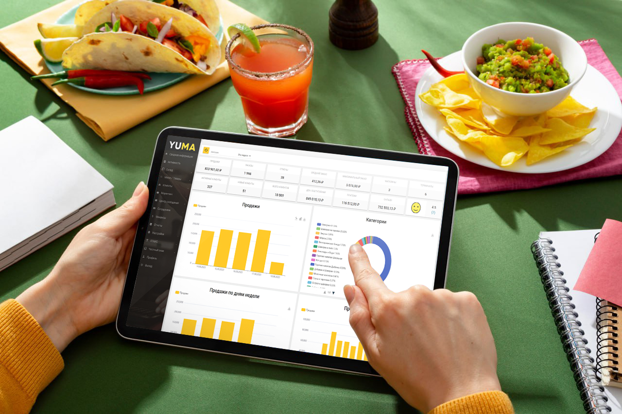 Экосистема YUMA охватывает все типы заказов, а значит ведет учет расчетов по ним. Более того, программа отслеживает складские остатки, помогает с инвентаризацией и работой с поставщиками через ЭДО, выгружает данные в 1С. Кроме того, с YUMA проще контролировать фудкост, вести анализ доходов и расходов, управлять рабочим временем персонала, составлять графики и рассчитывать зарплату.